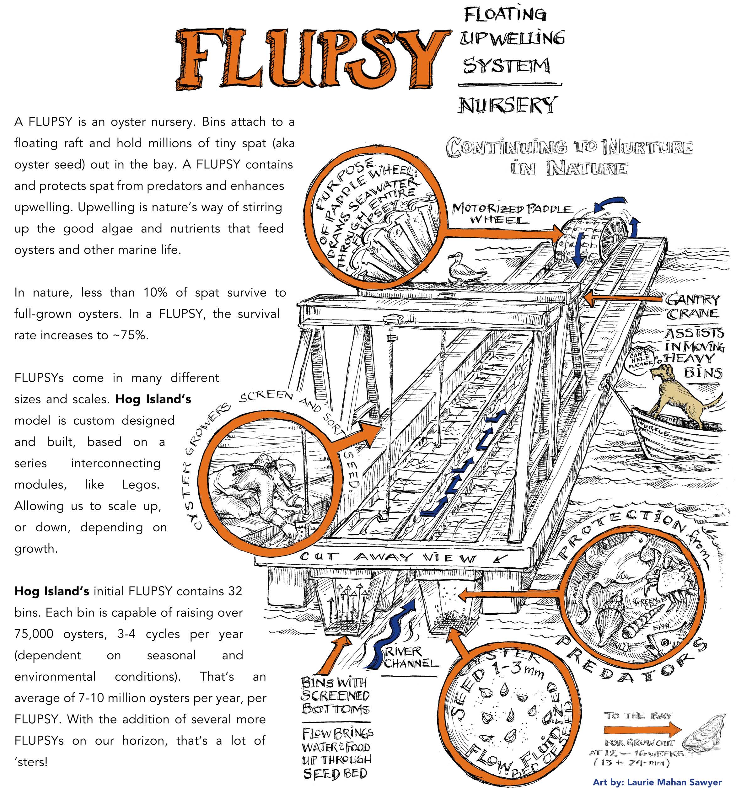 Hog Island Oyster’s nursery in Humboldt Bay is a custom-designed, state of the art FLUPSY (Floating Upweller System). When spat reach approximately 1-3 mm in size, they are transferred to our nursery, FLUPSY. A FLUPSY contains and protects young oysters and enhances the natural upwelling of nutrients and phytoplankton in the ecosystem that oysters feed on. Our nursery team tend to the oysters daily to monitor their health, condition, and growth.